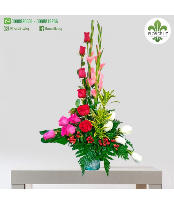 Arreglo en rosas rojas, fucsias y blancas, gladiolos, canción de la india, rusgo, helecho cuero, hipérico rojo, base vidrio.