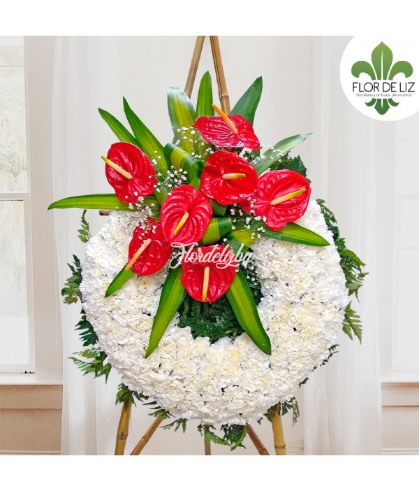 Corona elaborada en claveles, aplique en anturios, follaje en helecho cuero, hoja de lino y gipsophila.
