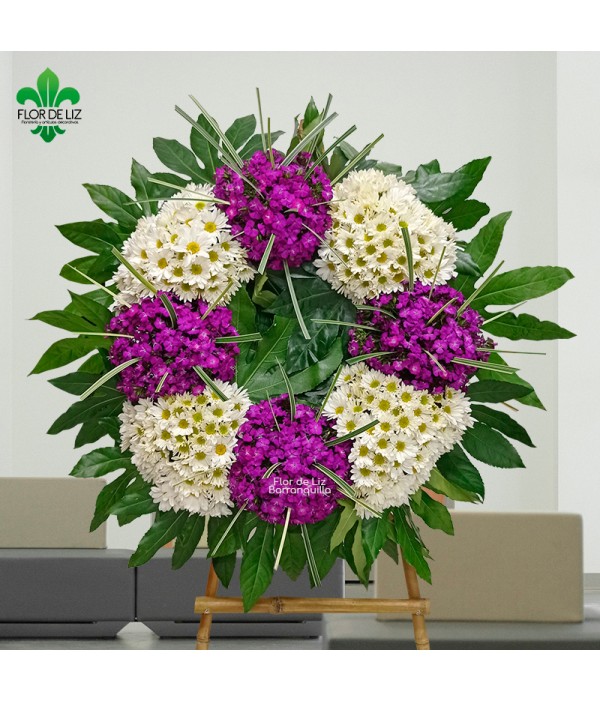Corona fúnebre elaborada en margaritas blancas y gipsi morada acompañada de manito de Dios y cintilla.