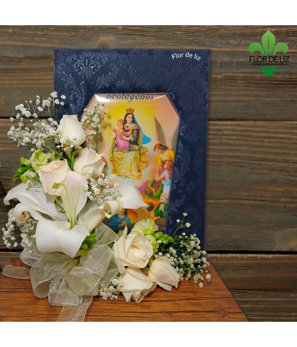 Sufragio en rosas blancas y lirio acompañado de follaje en boca dragón y gypsophila, lazo blanco.