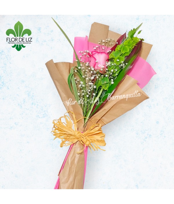 Hermoso ramillete elaborado en una rosa fucsia acompañado de campana irlanda, gypsophila, hoja de carey, cintilla y lazo.