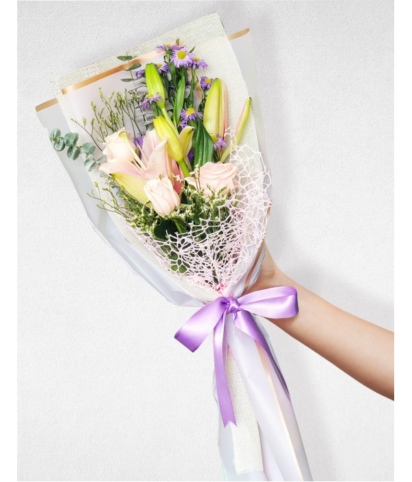 Ramillete en lirios y mini rosas, follaje