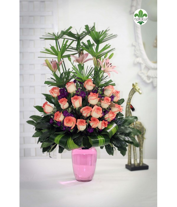 Arreglo elaborado en rosas gratinadas, lirios, papiros, rusgo, gipsy morada, manito de Dios, hoja dracena, base vidrio.
